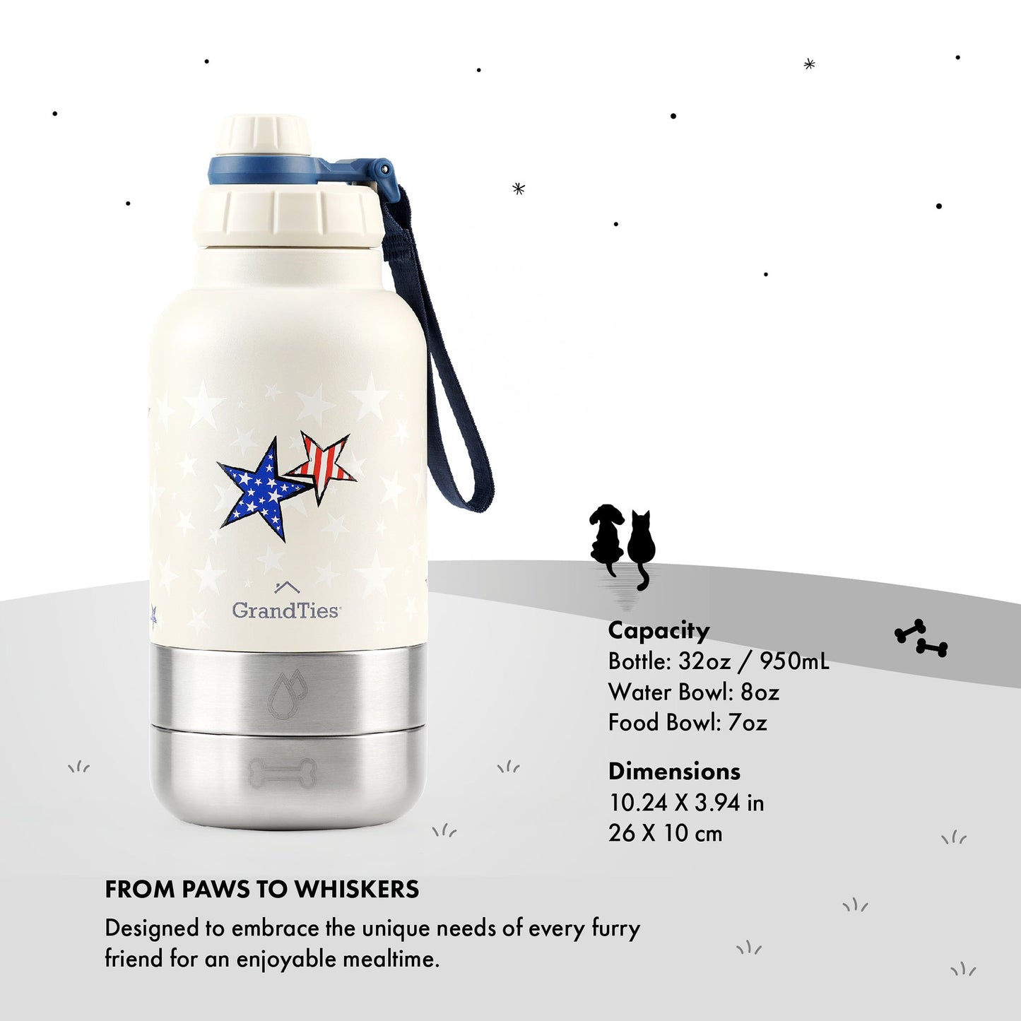 - Double-Duty Pet Bowls: GrandTies' dog water dispenser comes with 2 detachable bowls, serving water and food. Versatile and compact, a must-have for pet walks and trips.